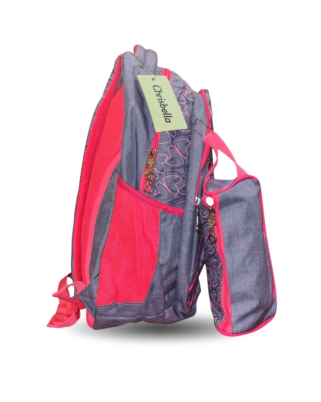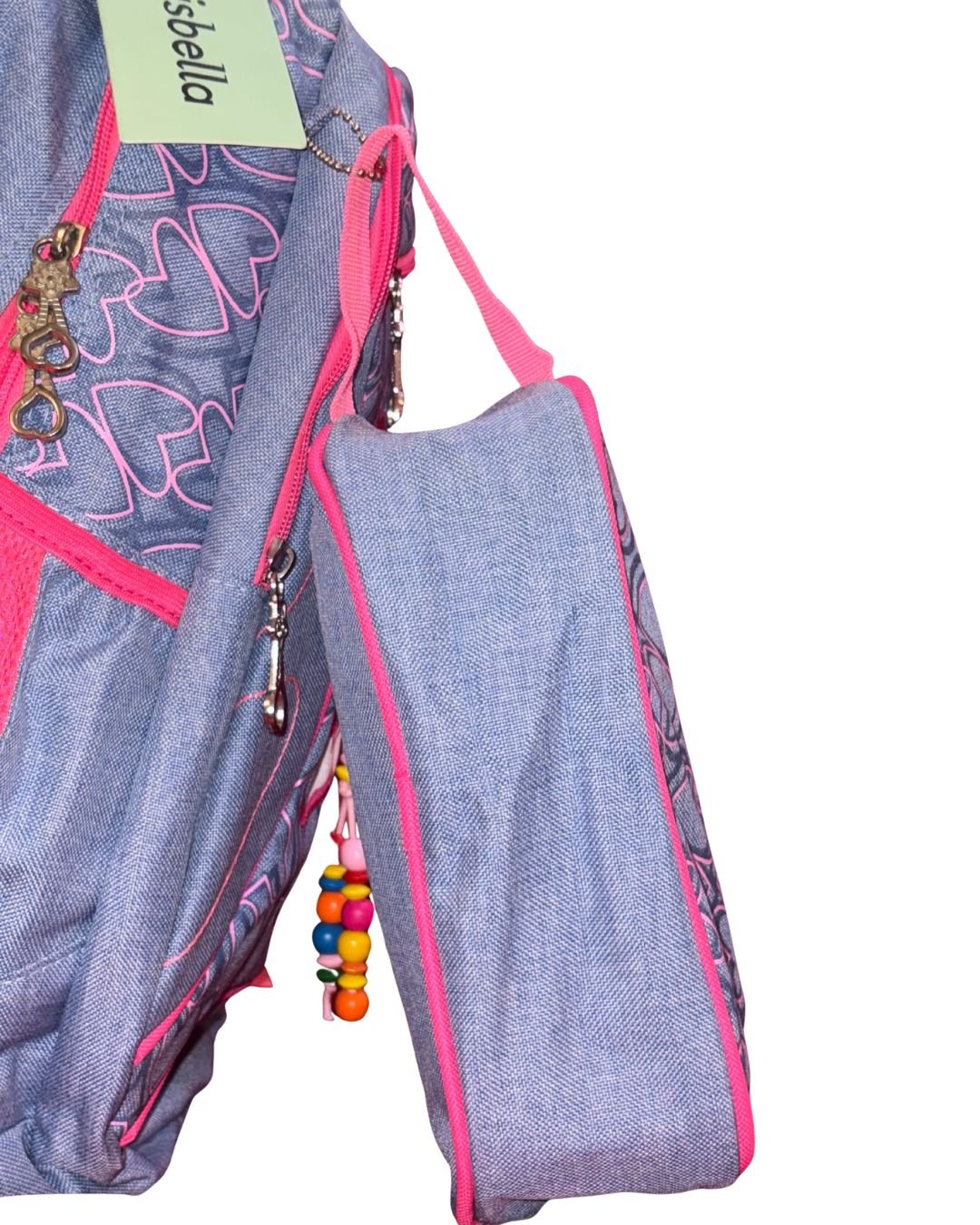 This stylish Chrisbella kids’ backpack features a blue color base with vibrant pink accents. The design includes heart patterns, embroidered text (“Kiss” and “Love”), and a decorative heart-and-lips patch. Colorful bead accessories add a playful touch. The backpack includes multiple compartments for organization and comes with a matching detachable pouch, making it ideal for school or everyday use.