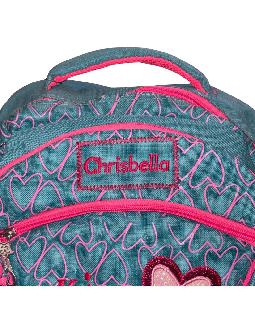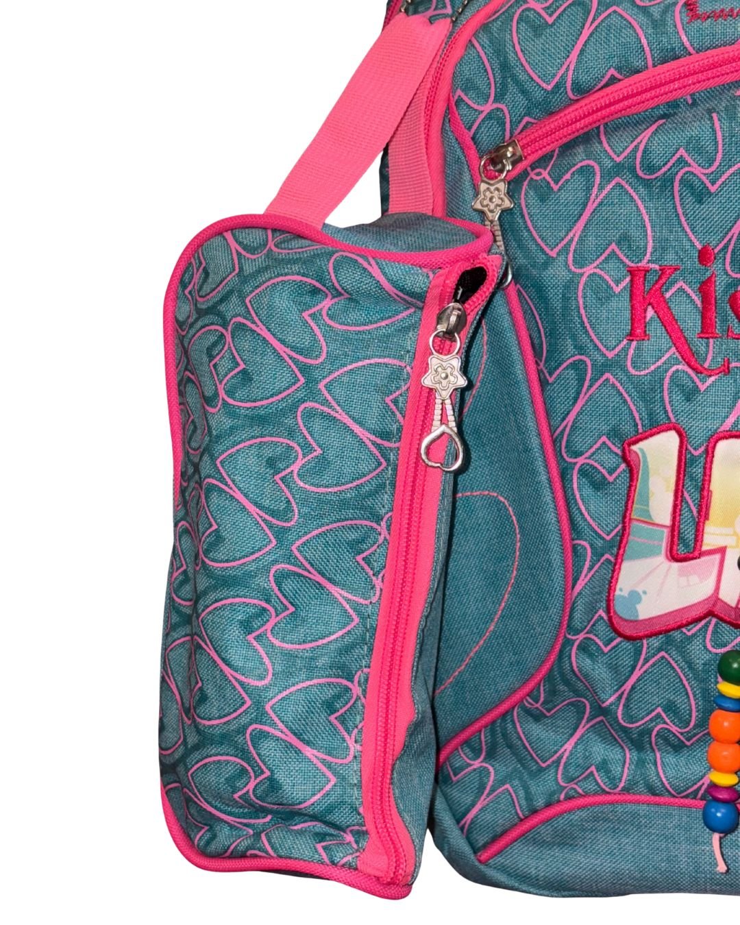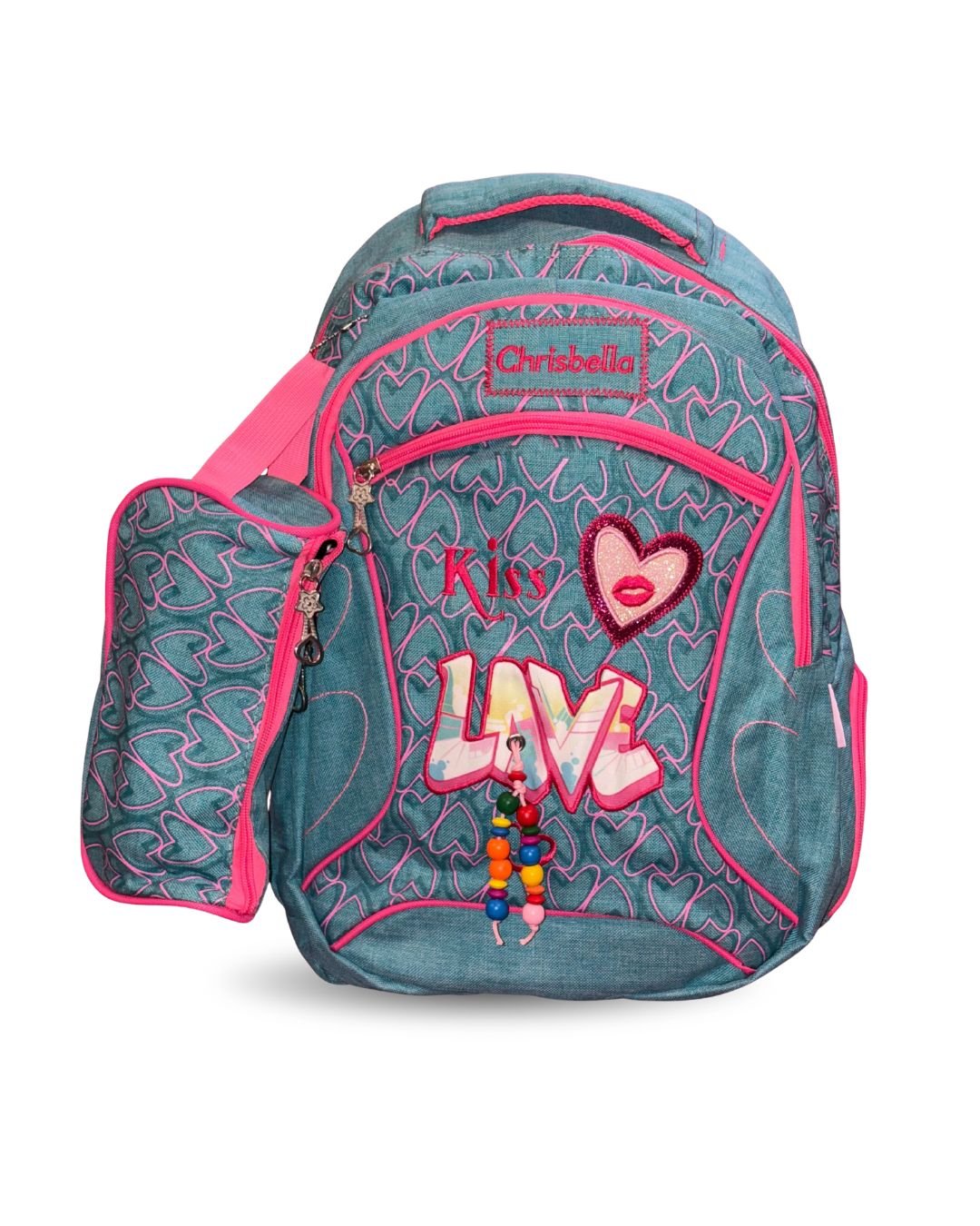 This stylish Chrisbella kids’ backpack features a denim-green color base with vibrant pink accents. The design includes heart patterns, embroidered text (“Kiss” and “Love”), and a decorative heart-and-lips patch. Colorful bead accessories add a playful touch. The backpack includes multiple compartments for organization and comes with a matching detachable pouch, making it ideal for school or everyday use.