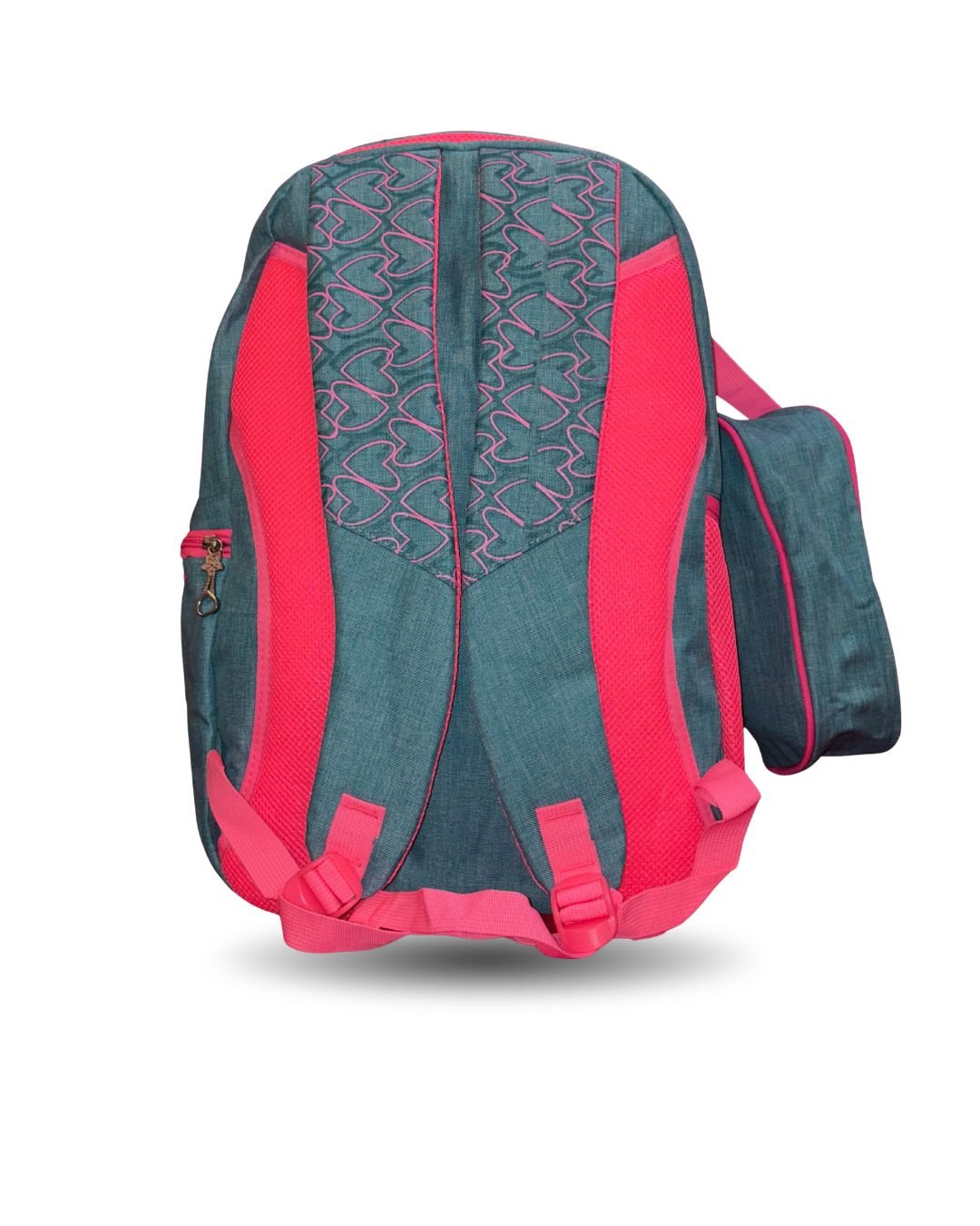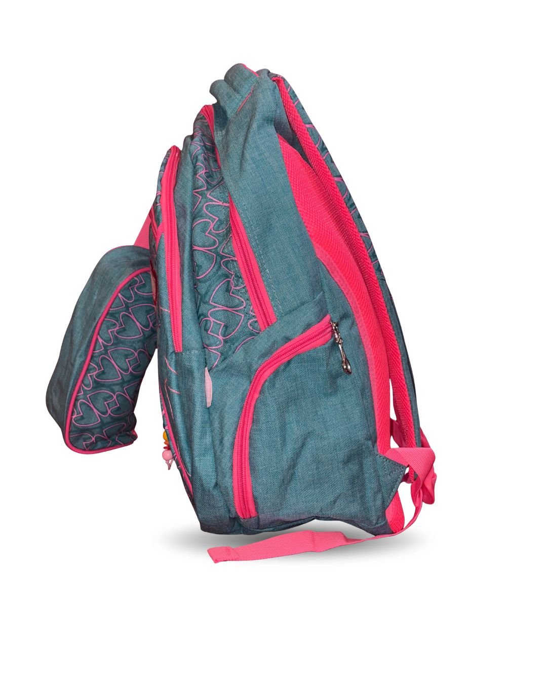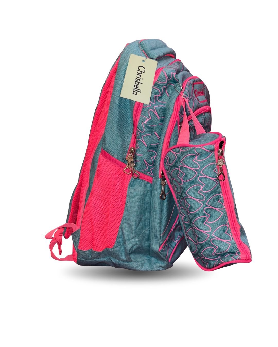 This stylish Chrisbella kids’ backpack features a denim-green color base with vibrant pink accents. The design includes heart patterns, embroidered text (“Kiss” and “Love”), and a decorative heart-and-lips patch. Colorful bead accessories add a playful touch. The backpack includes multiple compartments for organization and comes with a matching detachable pouch, making it ideal for school or everyday use.