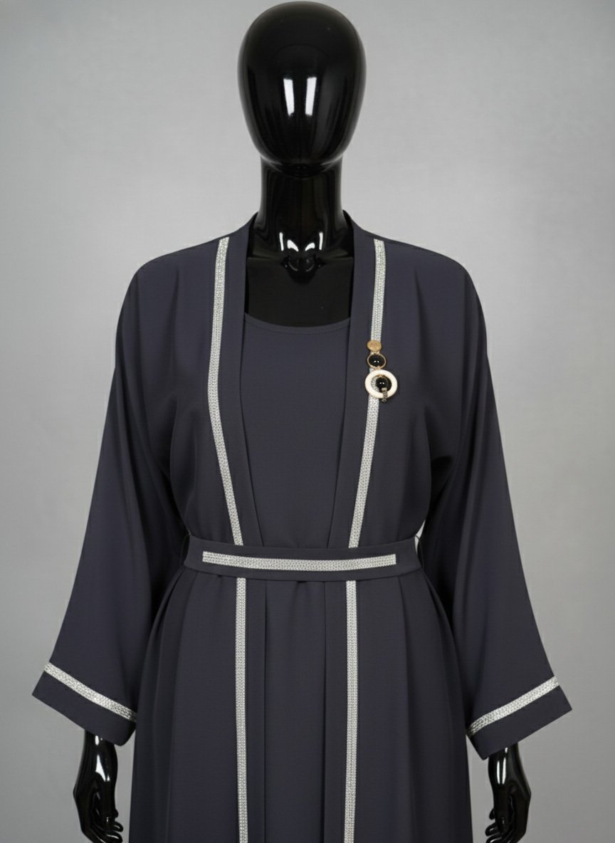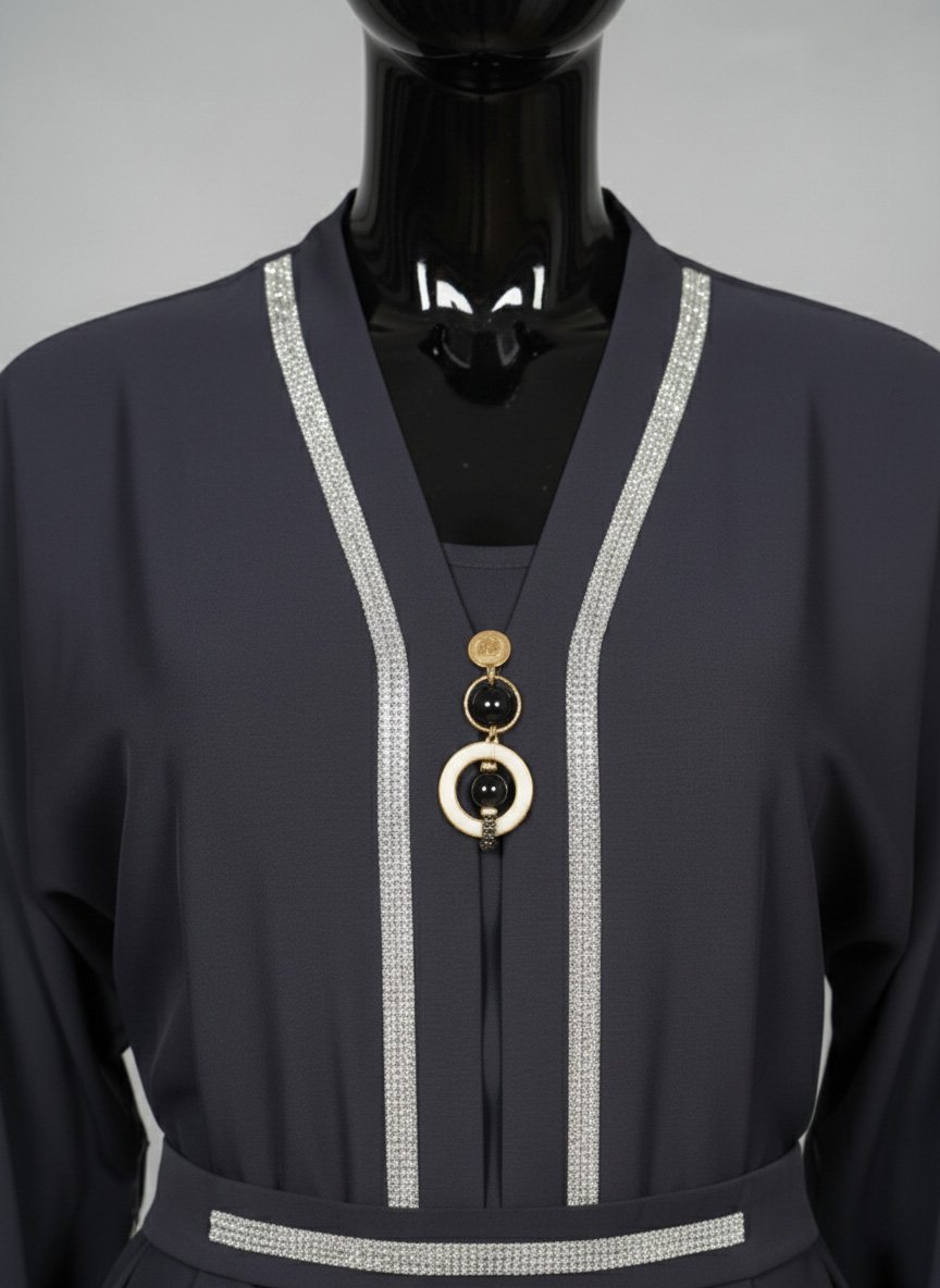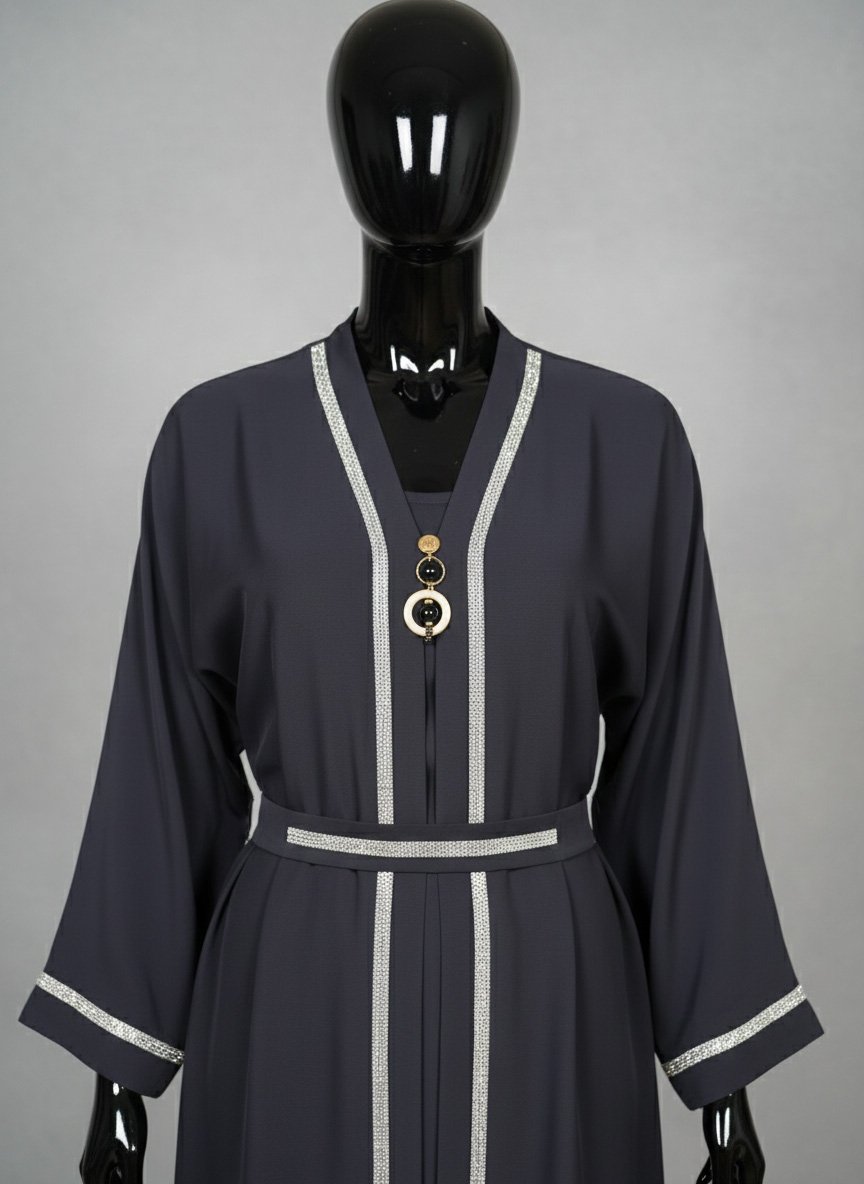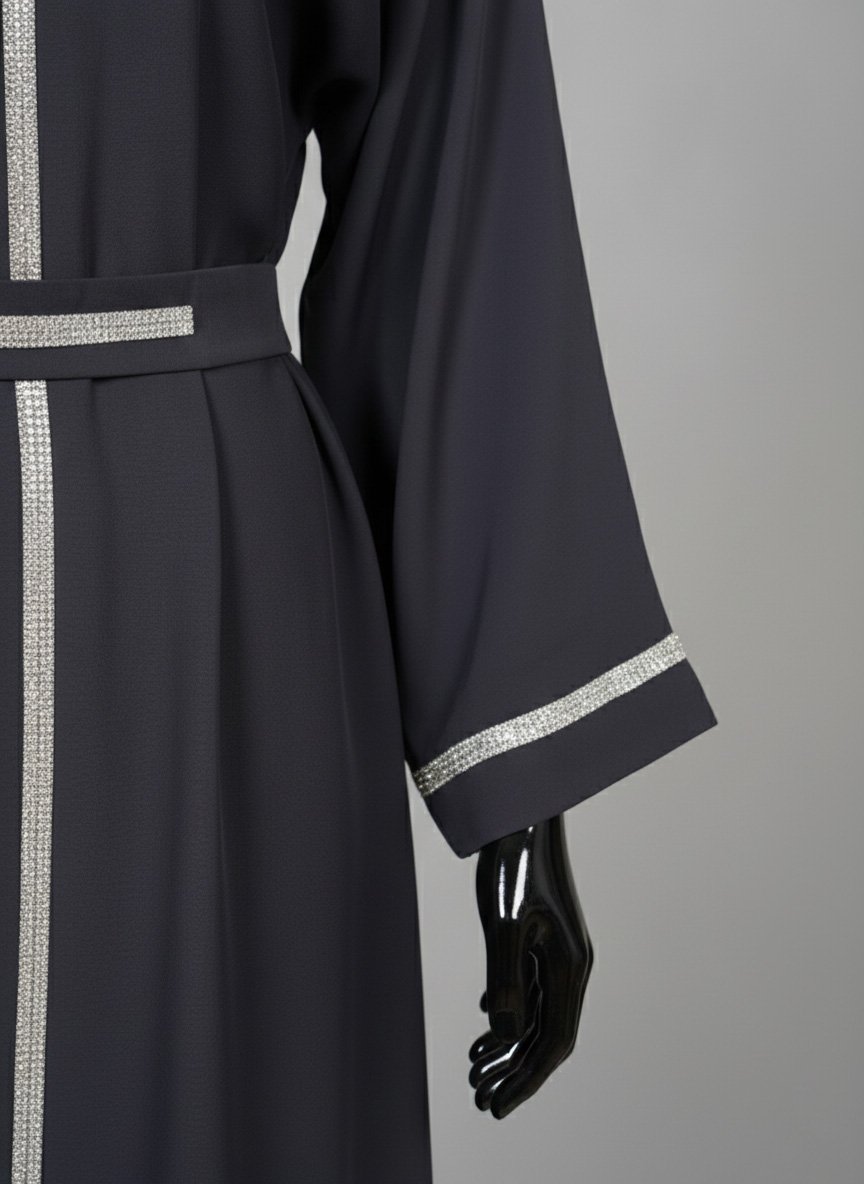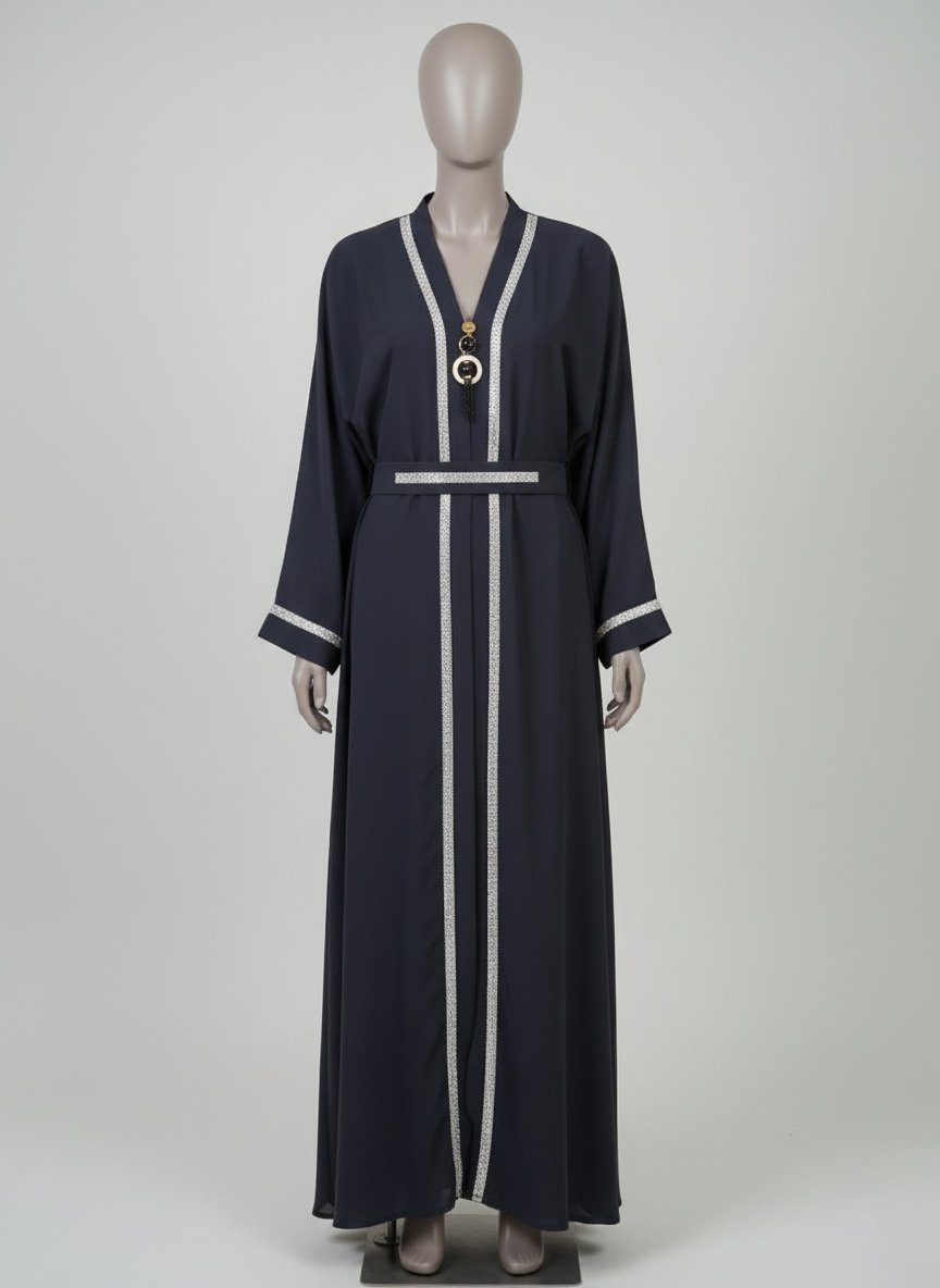 This abaya is a stylish and elegant design in a rich navy blue color. It features a modern and chic silhouette with a focus on clean lines and sophisticated detailing. The abaya is adorned with silver accents along the edges, particularly along the neckline, sleeves, and waist, adding a subtle sparkle and luxurious touch.