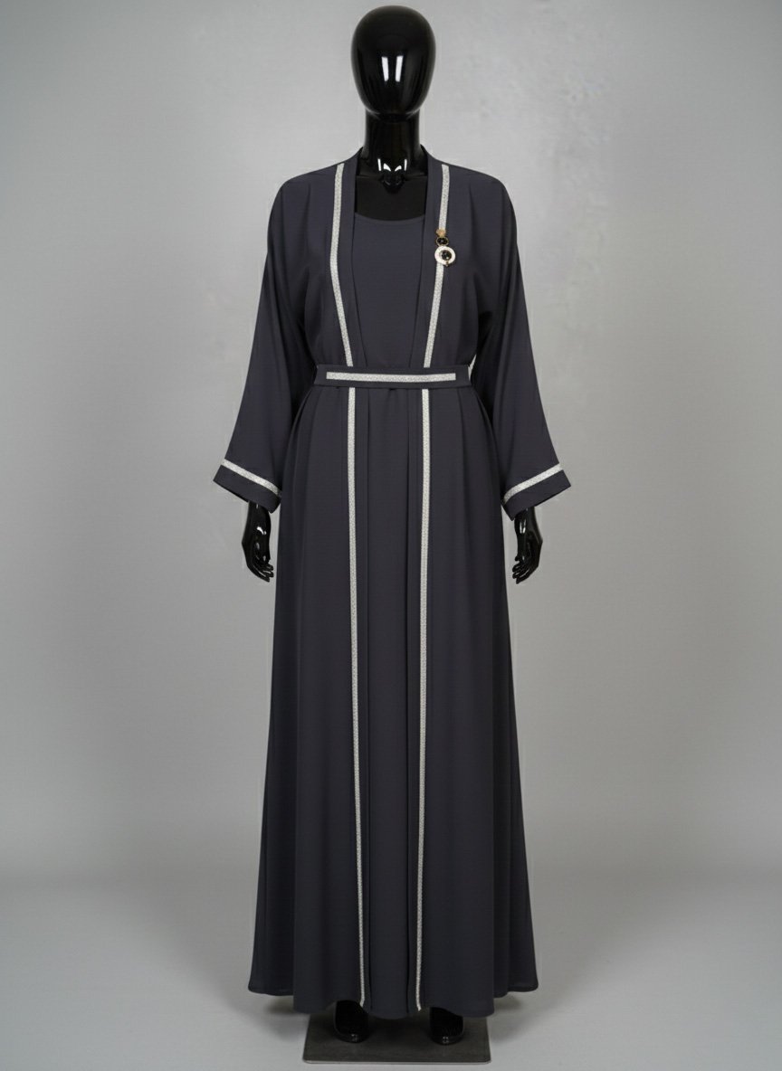 The front closure is designed with a unique gold and black ornament, which adds a statement piece to the outfit. The design is simple yet refined, with a smooth, flowing fabric that offers comfort and grace. The wide sleeves further contribute to its airy and elegant appearance, making it a versatile option for formal or semi-formal occasions. The waist belt gives it a fitted look while allowing for a flattering shape. This abaya blends traditional elements with contemporary fashion for a modern and elegant style.